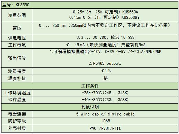 KUS550系列低功耗超聲波液位計(jì)在緊湊堅(jiān)固的PVC外殼中提供非常短距離到遠(yuǎn)距離的檢測和測距專為IP68水浸入設(shè)計(jì),比倍加福的產(chǎn)品應(yīng)用場景更加廣泛,窄聲束波束角確保高信號(hào)可靠性,支持模擬量,開關(guān)量,數(shù)字量,電壓,串口等多種輸出,寬電壓3.3~30V供電,灌膠耐酸堿,PVDF全氟塑料材質(zhì),小量程0.6米盲區(qū)是150mm,大量程2.5米盲區(qū)是250mm,半功率角7.5°,分辨率0.1mm,精度達(dá)0.5%F.S.,耐溫-40~85℃。多用于物聯(lián)網(wǎng),污水處理,罐體,智能垃圾桶等液位物位的測量。使用場景廣泛,用戶綜合體驗(yàn)度高。