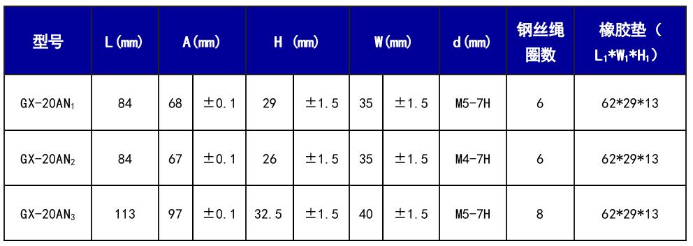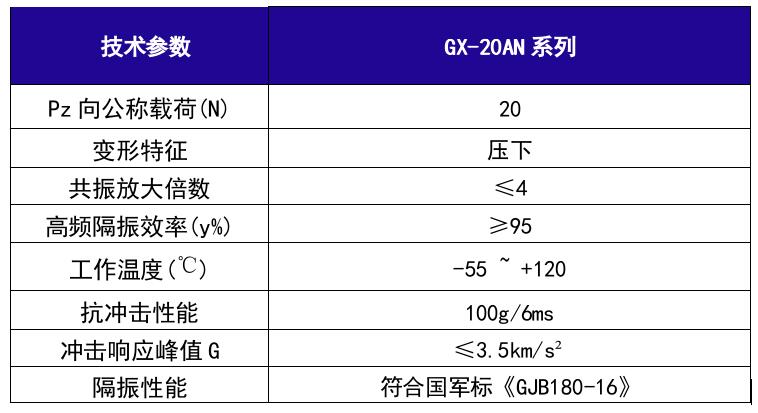 GX-20AN系列鋼絲繩隔振器Pz向公稱載荷為20N(2.04kg),根據(jù)其尺寸不同分為GX-20AN?型、GX-20AN2型和GX-20AN3型三種,GX-20AN系列鋼絲繩隔振器是對GX型鋼絲繩隔振器的進一步改進,將長方體的橡膠墊改為與鋼絲繩緊密相貼的拱形橡膠墊,不僅對Pz方向進行隔振緩沖,而且也保證了其它方向的隔振緩沖效果,可滿足高達100G以上的抗沖擊要求,適用于裝甲車輛、自行火炮、機載、車載、艦載等電子、機械設(shè)備、計算機與儀器儀表在高低溫、化學(xué)污染等惡劣環(huán)境下的隔振緩沖,導(dǎo)彈衛(wèi)星的運載、導(dǎo)航與發(fā)射系統(tǒng)的安全防護以及各類工業(yè)動力機械的工業(yè)降噪隔振等方面。